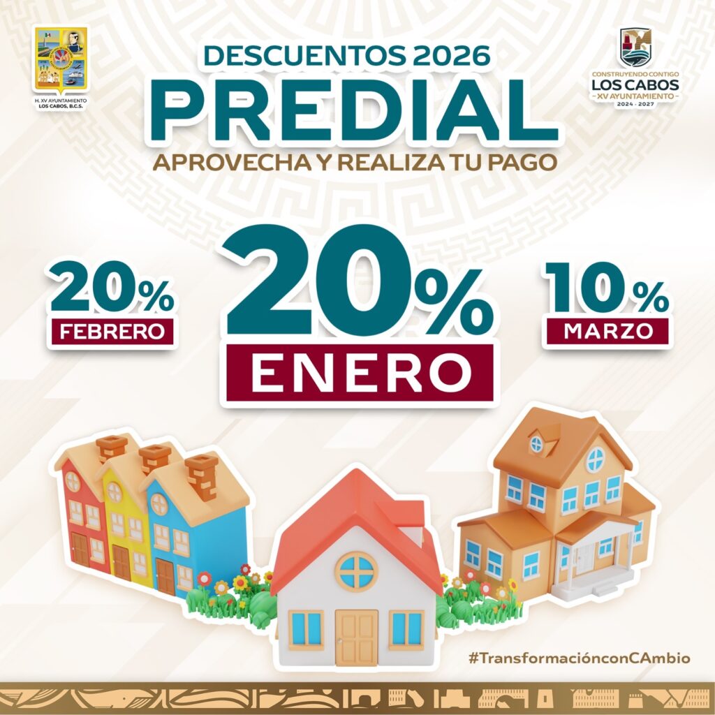 Los Cabos, Baja California Sur.– Con el objetivo de fomentar el cumplimiento oportuno de las contribuciones municipales y fortalecer las finanzas públicas, el XV Ayuntamiento de Los Cabos, que encabeza el alcalde Christian Agúndez Gómez, informa que a partir del 01 de enero de 2026 estarán vigentes los descuentos autorizados para el pago del impuesto predial.