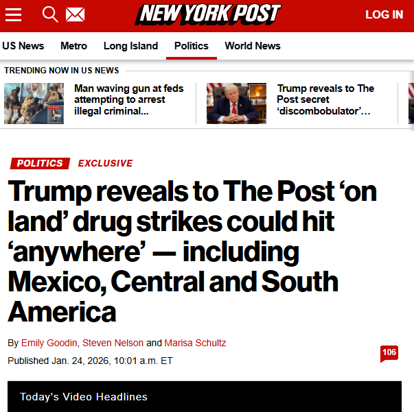 Trump dice a The New York Post que ataques terrestres a cárteles pueden ser en cualquier lugar incluído México, aunque Claudia Sheinbaum lo había descartado.