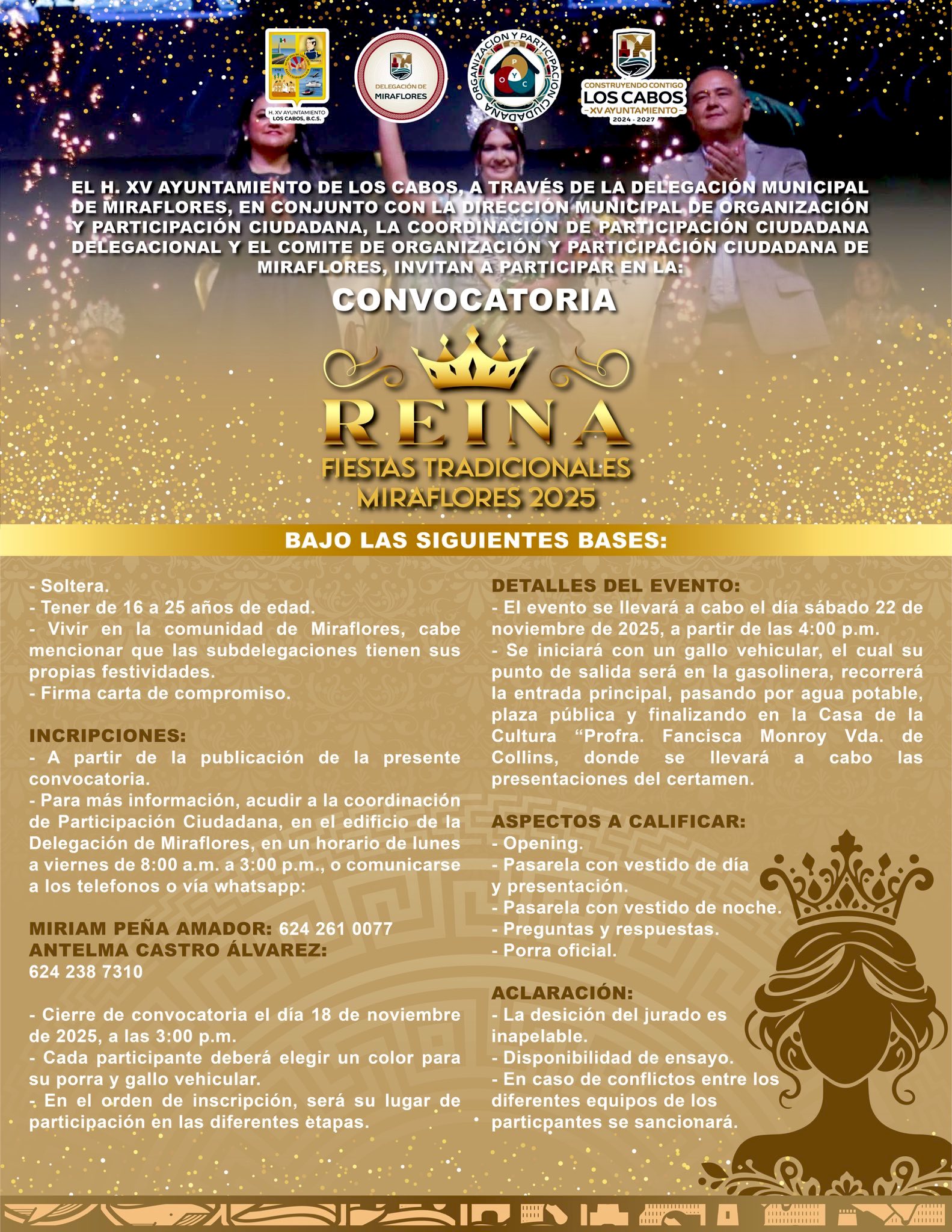 Asimismo, la Delegación Municipal de Miraflores, en coordinación con la Dirección Municipal de Organización y Participación Ciudadana, mantiene abierta la convocatoria para elegir a la Reina y Princesita de las Fiestas Tradicionales Miraflores 2025. Las inscripciones estarán disponibles hasta el próximo 18 de noviembre a las 15:00 horas, en las oficinas de la delegación.