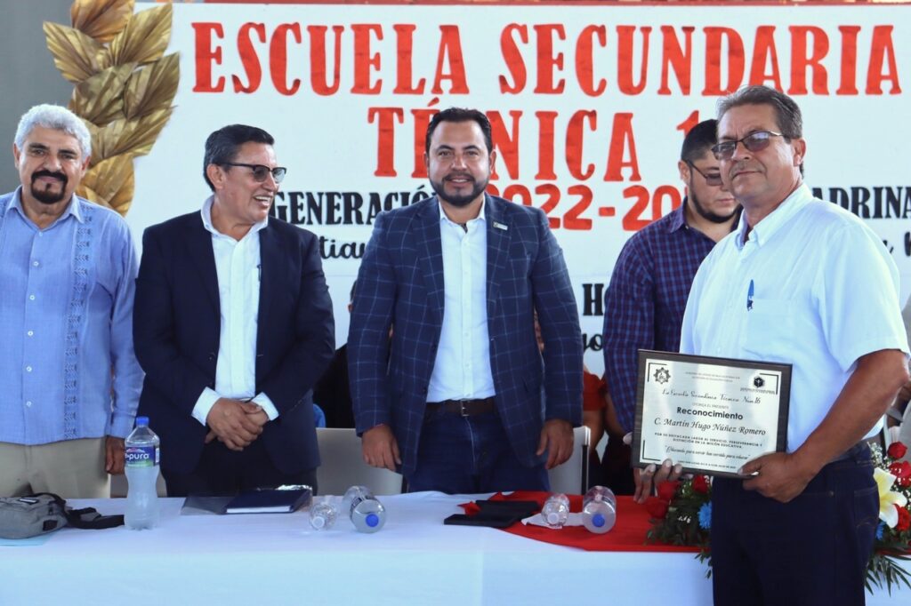 Durante la ceremonia de graduación, en la que 560 estudiantes de los turnos matutino y vespertino recibieron su certificado de conclusión de estudios, se rindió homenaje al profesor Martín Hugo Núñez Romero por sus 36 años de servicio en el sector educativo.