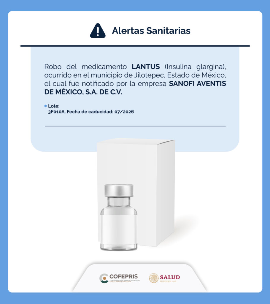 La Comisión Federal para la Protección contra Riesgos Sanitarios (Cofepris) emitió este lunes una alerta sanitaria por el robo del medicamento Lantus, una insulina utilizada para el tratamiento de la diabetes. La autoridad advirtió que la posible distribución ilegal del producto representa un riesgo para la salud de la población.