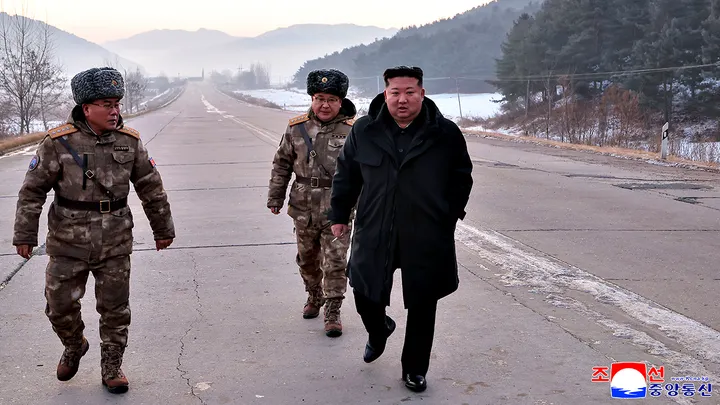 En esta fotografía proporcionada por el gobierno norcoreano, el líder Kim Jong Un camina por una calle mientras inspecciona vuelos de prueba de misiles hipersónicos en Pyongyang, Corea del Norte, el domingo 4 de enero de 2026. (Agencia Central de Noticias de Corea/Servicio de Noticias de Corea vía AP)