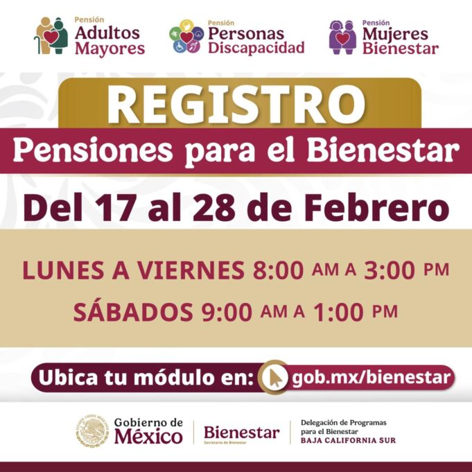 Convocó a los Adultos Mayores de 65 años, Personas con Discapacidad y Mujeres Bienestar que tienen o cumplen entre enero y febrero 63 años acudir a los Módulos de Bienestar que brindan atención de lunes a sábado, de 10:00 a 16:00 horas. Para conocer fecha de registro y ubicación de los Módulos Bienestar, consultar la página oficial de la Secretaría de Bienestar gob.mx/bienestar.