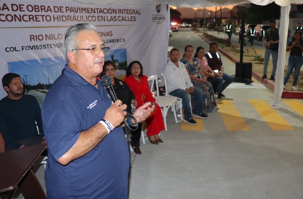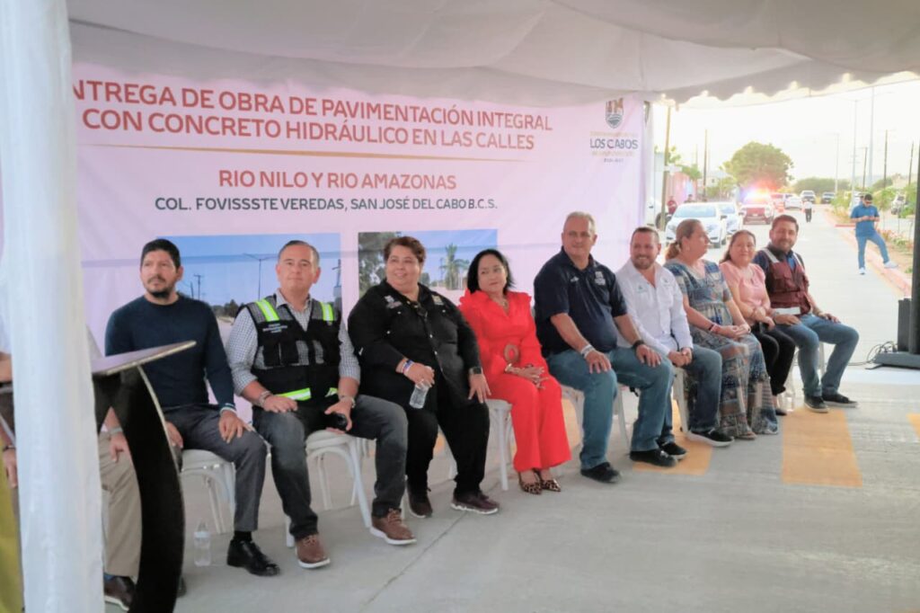Los Cabos, Baja California Sur.– Autoridades de la XV Administración de Los Cabos llevaron a cabo la entrega de la pavimentación con concreto hidráulico de las calles Río Nilo (entre Río Rhin y Río Balsas) y Río Amazonas (entre Río Éufrates y Río Níger) en la colonia FOVISSSTE Las Veredas, beneficiando a más de cinco mil habitantes de la zona. En representación del presidente municipal Christian Agúndez Gómez, acudió el jefe de Gabinete, Guillermo Sánchez Flores.