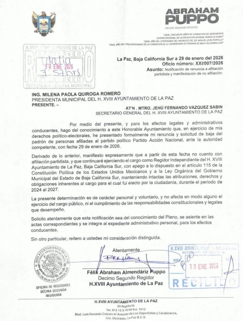 +En La Paz el regidor Abraham Puppo, renuncia a su militancia al PAN. Se desmorona la pusilánime dirigencia de Rigo Mares.