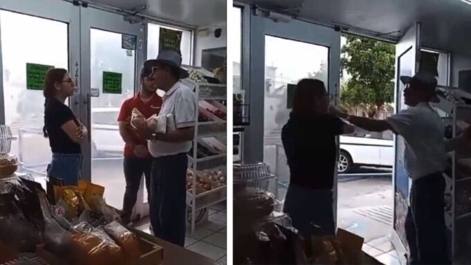 Antes de salir de la tienda, el sujeto manotea con Alma Lourdes mientras la insulta. Un empleado de la tienda llega para ayudarla y empuja al agresor, quien cae al suelo afuera del local.