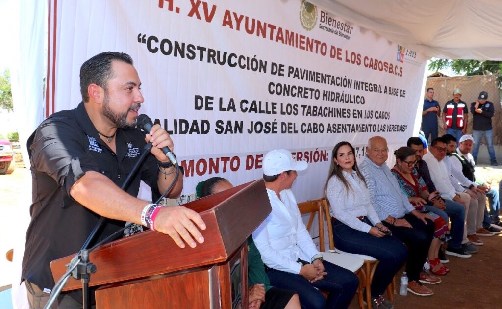 Los Cabos, Baja California Sur.– En un esfuerzo por continuar mejorando la movilidad y la calidad de vida de las familias cabeñas, el gobernador del estado Víctor Manuel Castro Cosío y el presidente municipal de Los Cabos Christian Agúndez Gómez, encabezaron el inicio de la obra de pavimentación integral con concreto hidráulico en la calle Los Tabachines de la colonia Las Veredas, con una inversión total de 13 millones 597 mil 186 pesos.