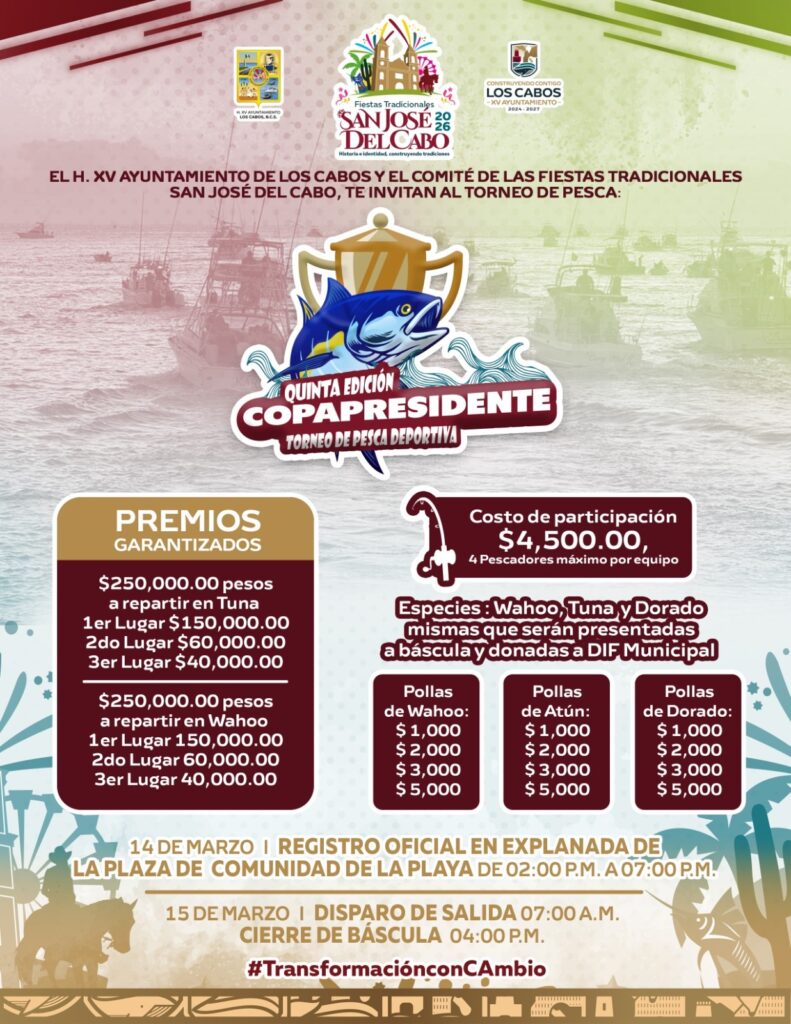 Los Cabos, Baja California Sur.– Como parte de las actividades programadas en el marco de las Fiestas Tradicionales San José del Cabo 2026, mañana domingo 15 de marzo se llevará a cabo la Quinta Edición de la “Copa Presidente” Torneo de Pesca Deportiva, teniendo como sede la comunidad de La Playa.