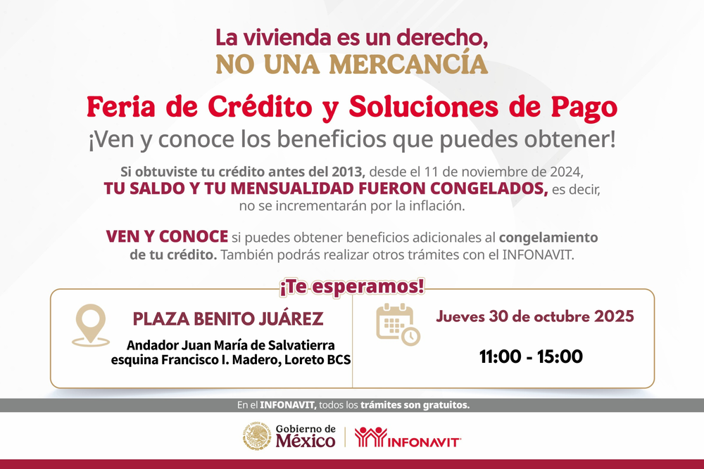 Este jueves 30 de octubre de 11 a 15:00 horas Plaza Benito Juárez a un costado de palacio municipal, Andador Juan María de Salvatierra esquina Francisco I. Madero, Loreto BCS.