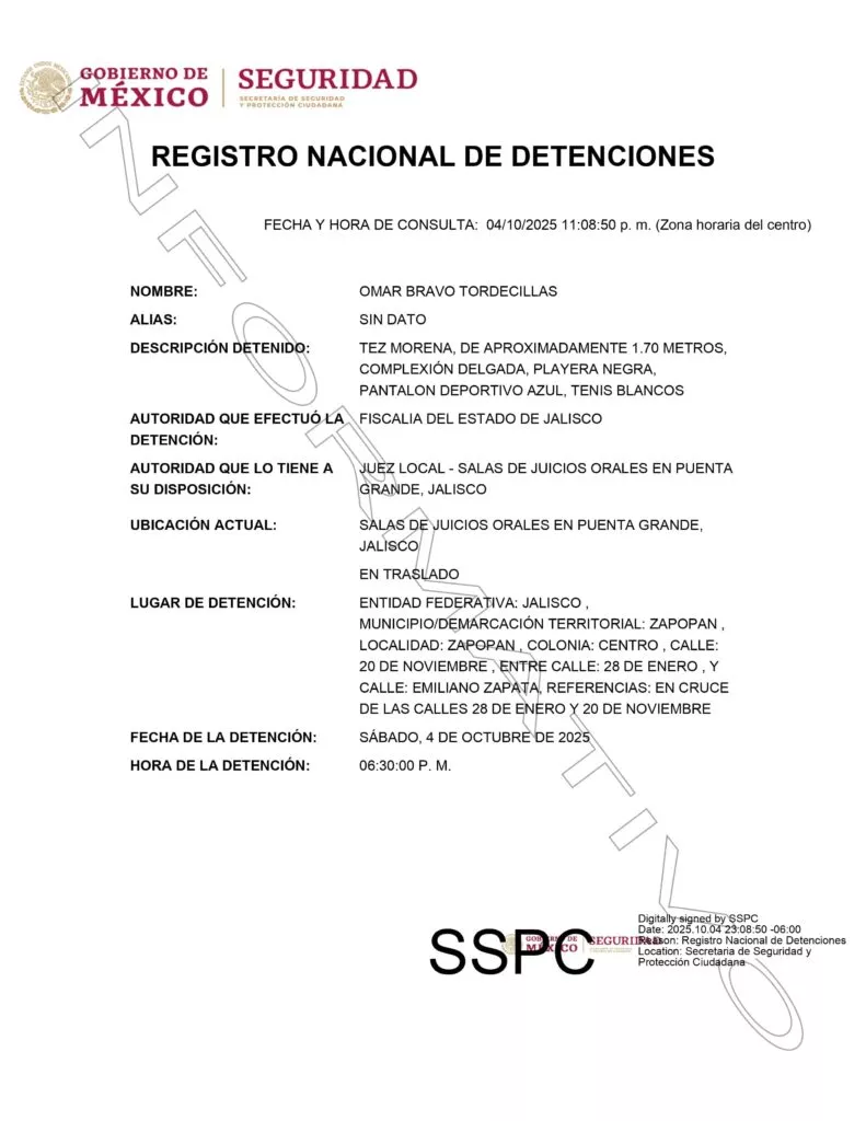 Fue de este modo que el pasado 30 de septiembre la joven acudió a interponer su denuncia ante las autoridades. Cuatro días después fue detenido Omar Bravo en la colonia Centro del municipio de Zapopan, en Jalisco. Le leyeron los cargos en su contra y se ordenó su encarcelamiento para dar seguimiento al proceso y definir su situación legal.