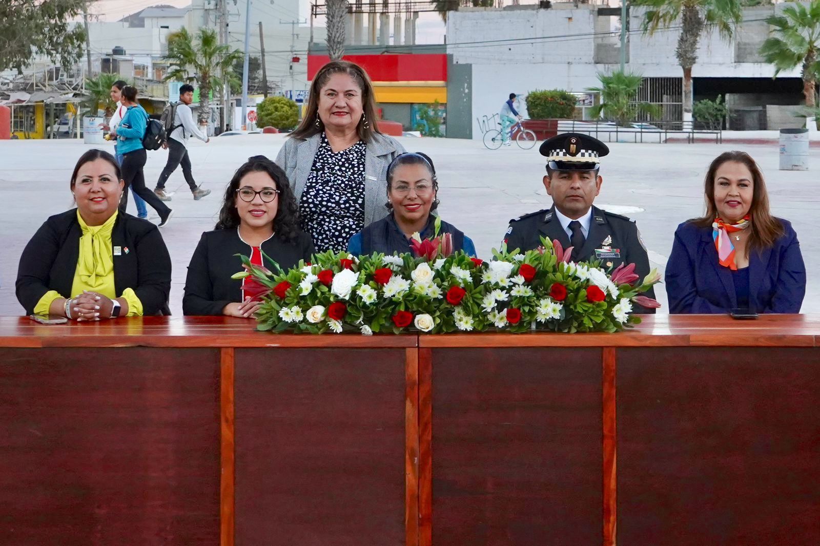 Durante el acto cívico se contó con la presencia de la responsable de la Dirección Municipal de la Visitaduría Interna Brenda Guadalupe Galvez Rivas en representación de la síndica municipal, Nélida Dolores Alfaro Rosas; el contralor municipal, Mario Alejandro Fernández Briseño; el coordinador municipal de Zofemat, Rafael Álvarez Munguía; el capitán de corbeta Bayron Ramales, en representación del Sector Naval de Cabo San Lucas; el teniente de la Guardia Nacional, Mario Taboada Landa; la directora municipal de Educación, Divulgación y Promoción Ambiental, Cristina Núñez Cosío; la directora municipal de Organización y Participación Ciudadana, Judith Pérez Herrera; el director del Cobach No. 04, Renato Leal Flores; así como la subdirectora de la Escuela Secundaria Técnica No. 16, Maribel Angulo Osuna.