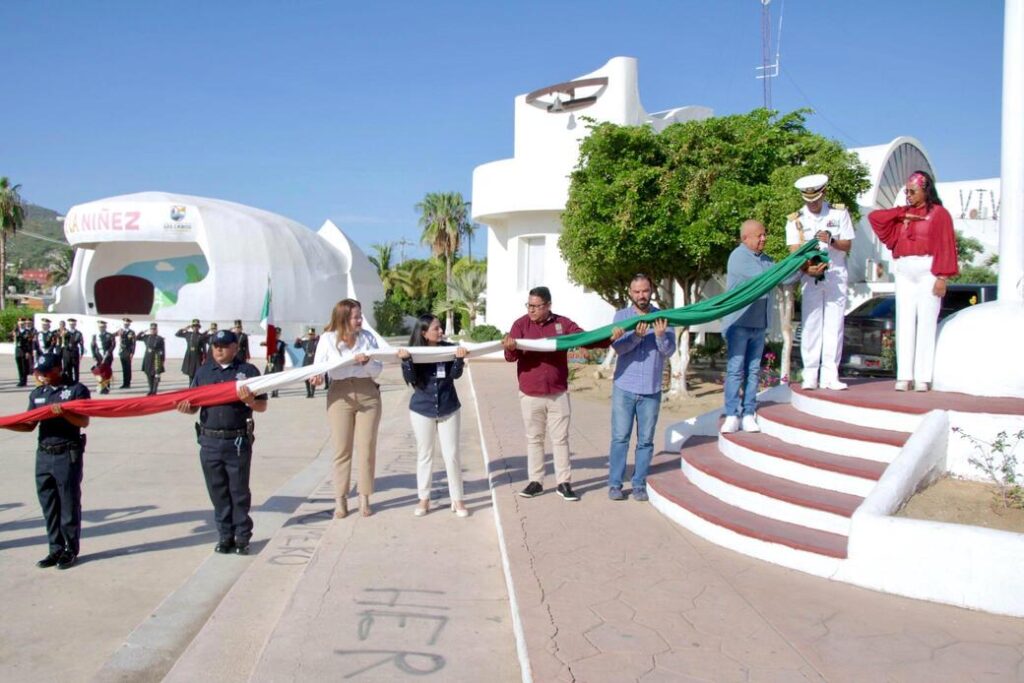 En Cabo San Lucas, la delegada Karina de la O Uribe, presidió ceremonia cívica, destacando en su mensaje que en estas fechas se recuerda a los héroes que dieron la libertad e independencia, además de que representa una oportunidad para reflexionar sobre lo que significa ser parte de la gran nación.