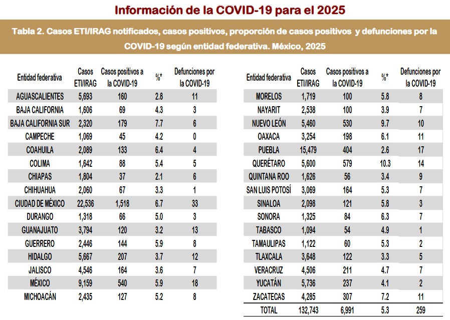De acuerdo con el informe semanal para la Vigilancia Epidemiológica de Influenza, COVID-19 y otros virus respiratorios 2025, la Ciudad de México (CDMX) es la entidad con más contagios y fallecimientos por el virus.